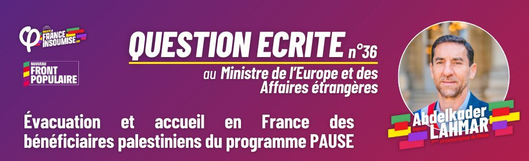 M. Abdelkader Lahmar attire l’attention de Monsieur le Ministre de l’Europe et des Affaires étrangères sur la question des engagements de la France vis à vis de Palestiniens et Palestiniennes de la bande de Gaza, artistes et universitaires lauréats du programme PAUSE et à ce titre bénéficiaires d’un programme d’accueil en France. A ce jour 26 bénéficiaires ont été sélectionnés par le comité de pilotage du programme qui comprend des fonctionnaires du ministère de l’Intérieur et du ministère de l’Europe ou du ministère Affaires étrangères. La France s’est engagée à demander leur évacuation ainsi que celle de leurs familles et à les accueillir sur le sol français sur lequel ils collaboreront avec des universités et institutions françaises.