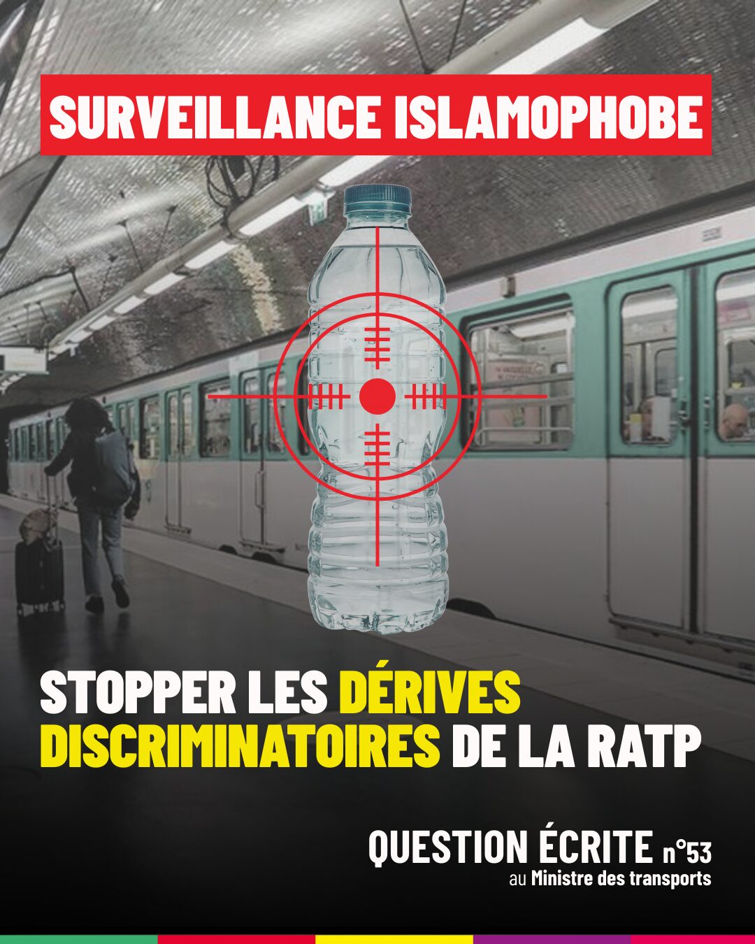 Intitulé « Mise en œuvre du plan ”Travailler ensemble” », cette note révélée par la presse, vise à étendre l’obligation de neutralité d’agents du service public à des prestataires extérieurs n’étant pas au contact du public. Pire, sous couvert de défense de la laïcité, les cadres de la RATP sont invités à faire la chasse aux bouteilles d’eaux dans les vestiaires et les sanitaires réservés au personnel pour éviter qu’elles en soient utilisées dans le cadre d’ablutions à caractère religieux. La laïcité est donc, une fois de plus, instrumentalisée afin de stigmatiser nos compatriotes musulmans.